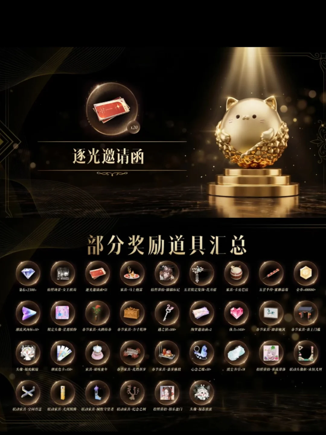 新春登录奖励:活动期间每日登录可领取钻石、逐光邀请函、金币、体力等资源,还有拍照场景、头像、萌拍等外观奖励。