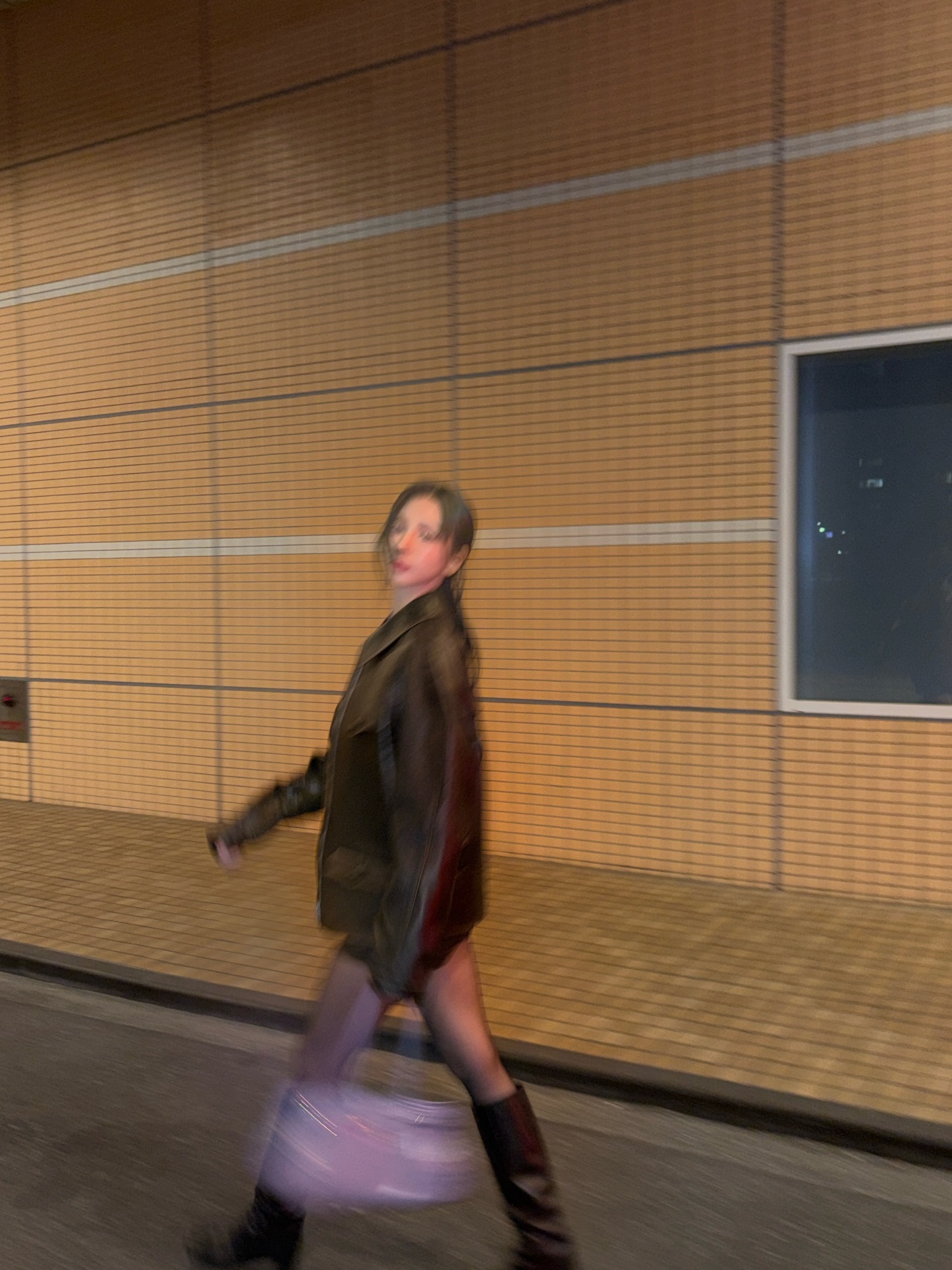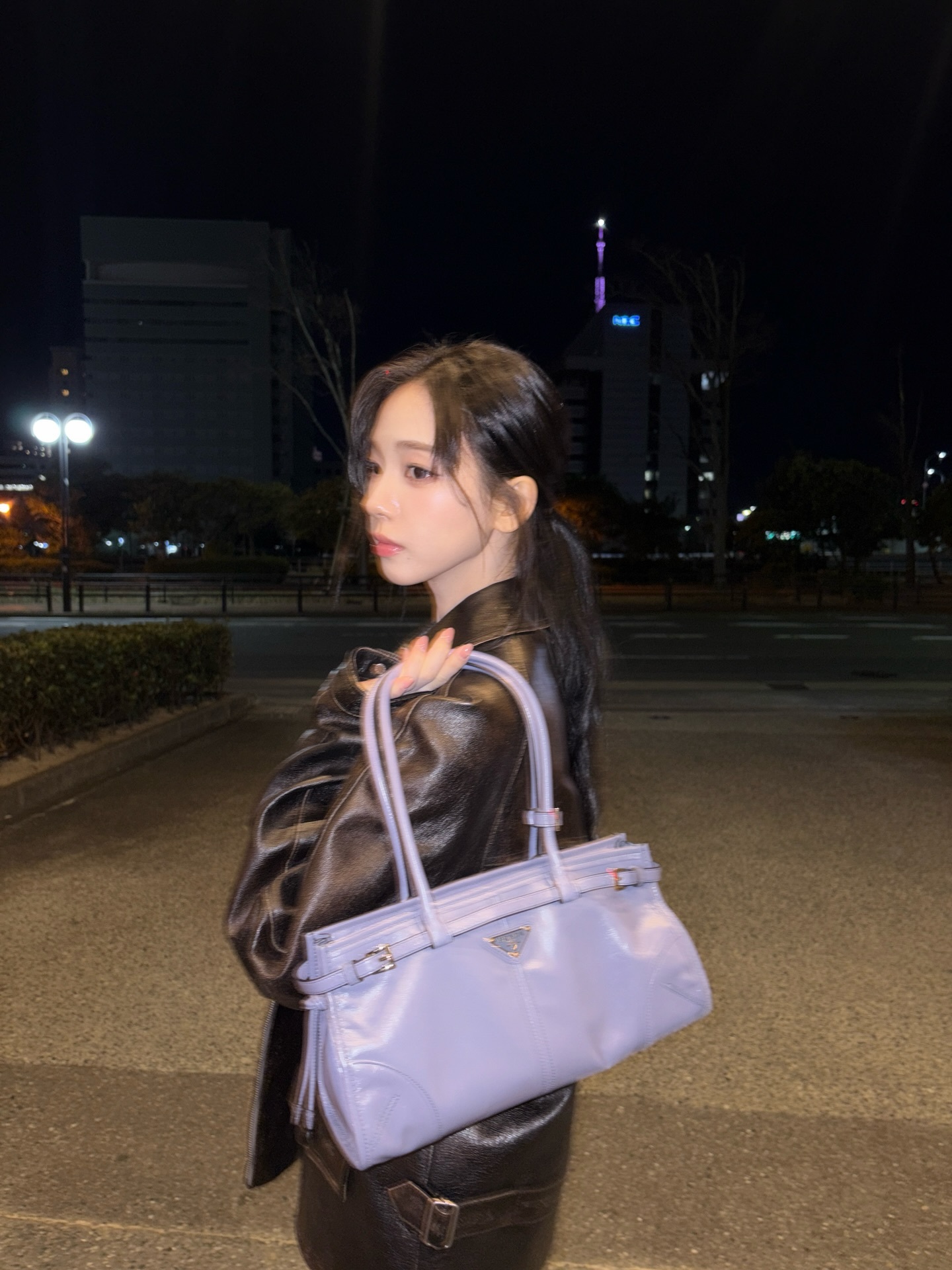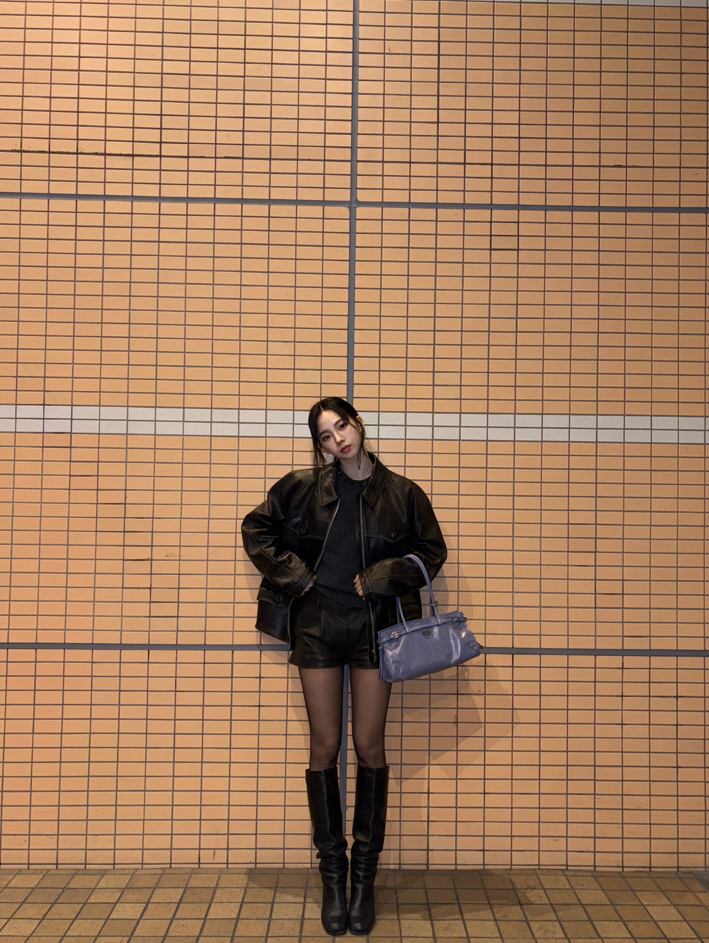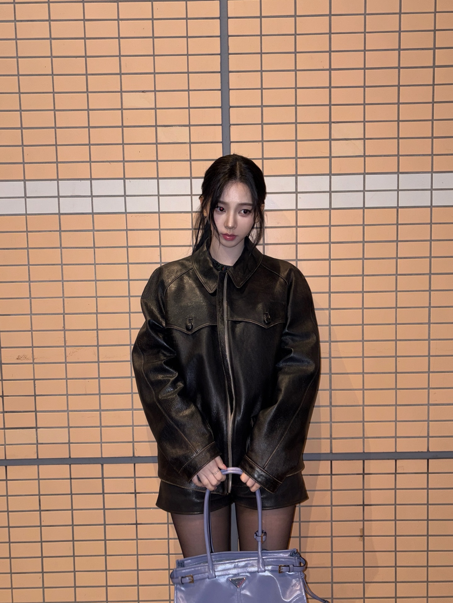Karina x Prada | Day & Night深棕色皮制外套与短裤搭配
