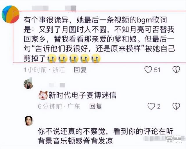 她视频中的背景音乐令众多网友深思。歌词写道:“又到了月圆时人不圆,不知月亮可否替我回家乡,替我看看那亲爱的爹和娘……”这配乐仿佛为她的离世蒙上一层沉重色彩,令人唏嘘不已。