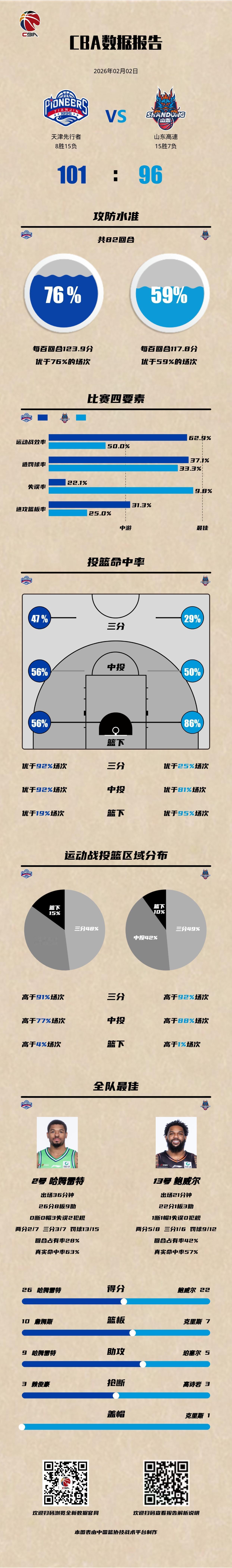天津先行者 101-96 山东高速天津男篮vs山东男篮 天津先行者:哈姆雷特26分8篮板9助攻,林庭谦25分7篮板6助攻,詹姆斯12分10篮板; 山东高速:鲍威尔22分3助攻,珀塞尔20分3篮板5助攻,克里斯13分7篮板。CBA数据库