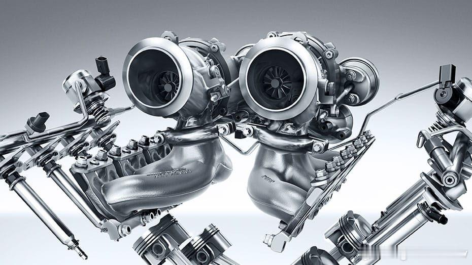 图3为之前AMG GT黑色系列的涡轮增压系统。其对应的引擎曲轴采用传统平面曲轴,且每个涡轮用上的双涡流设计。固然双涡流设计可以充分利用排气脉冲,但1、4气缸对应的排气歧管长度,明显长于2、3的排气歧管。不等长的排气歧管设计,可能是妥协了布局,但没法保证单侧4个气缸在任意转速下,相互一致的排气扫气性能。