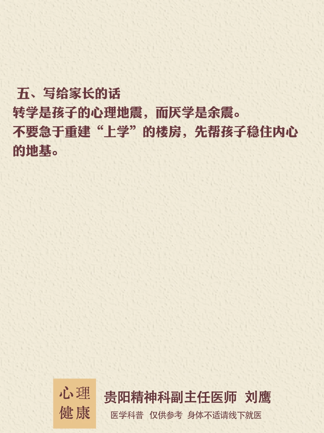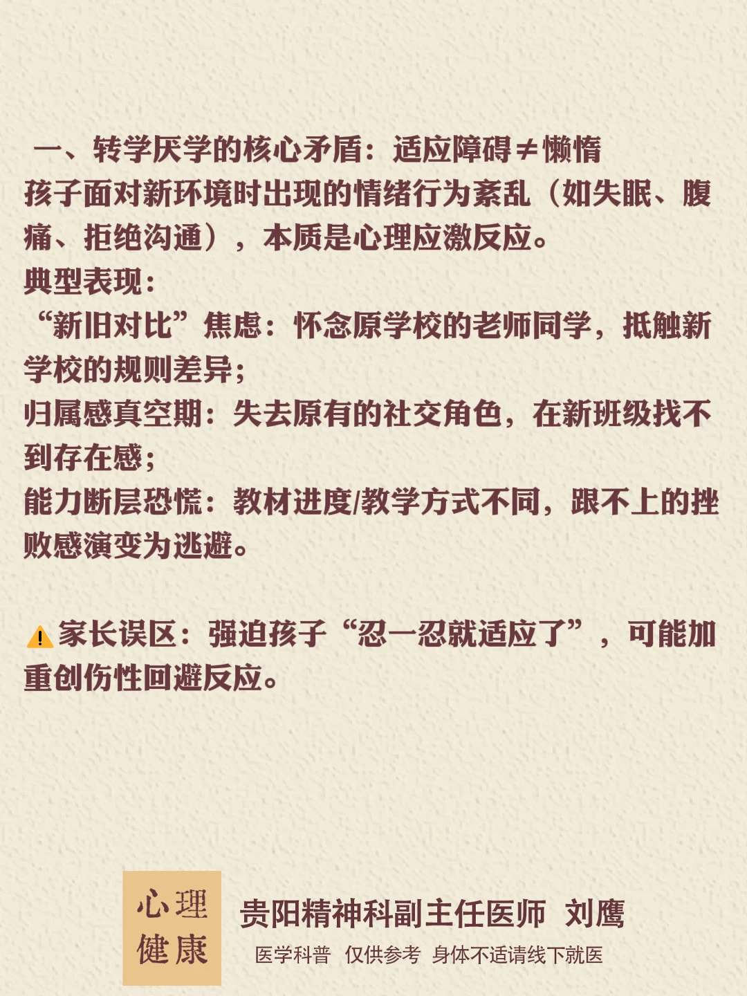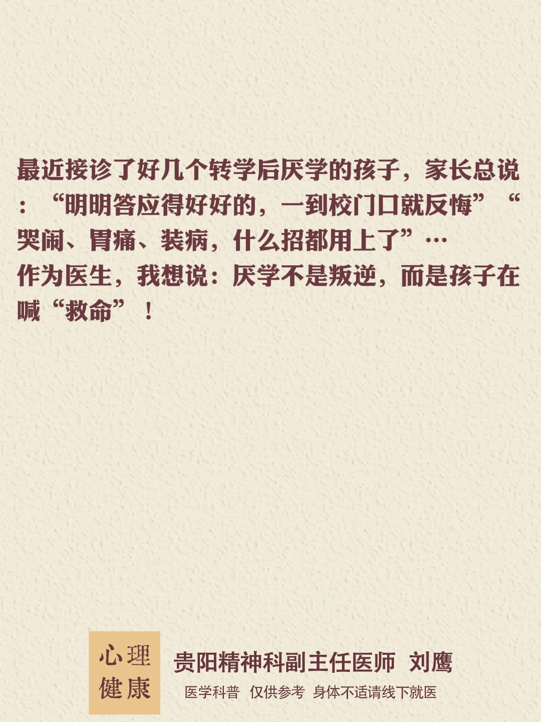 贵州的朋友们,大家好,我是贵阳精神心理科医生刘鹰厌学是孩子发出的“求救信号”,而非叛逆!家长的第一反应应是“陪伴”而非“逼迫”。