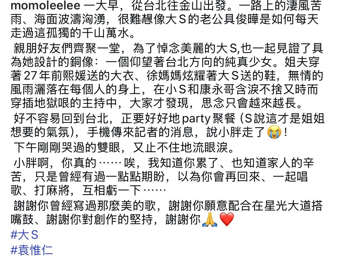陶晶莹发文悼念大S和袁惟仁:一大早,从台北往金山出发。一路上凄风苦雨、海面波涛汹