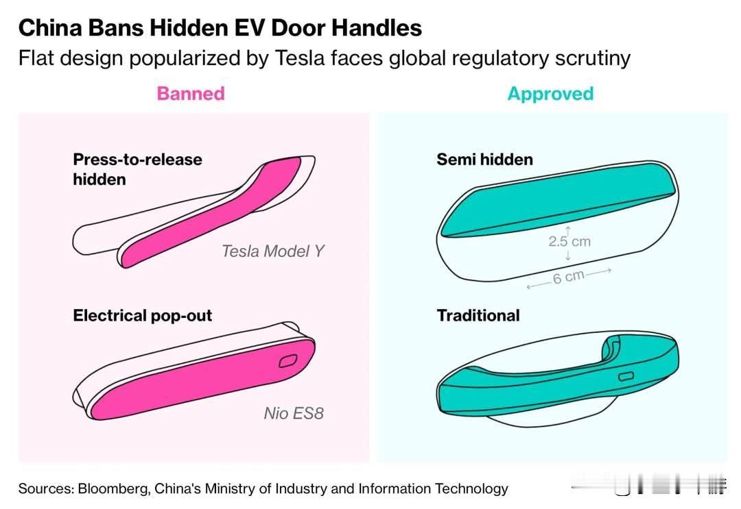 中国电动车车门设计新安全规范相关内容 中国正式发布新安全规范,将成为全球首个禁止电动车采用隐藏式车门把手设计的国家。根据彭博报道,新规要求在中国销售的电动车,车门内外都必须配备机械式开门装置,以避免在断电或系统失效时,无法开门逃生。 该政策由工信部发布,预计自2027年1月1日起实施;已通过审批、接近上市的车型,可延迟至2029年完成改版。这类贴平式、伸缩式把手原本由特斯拉(Tesla)引领风潮,主打科技感与风阻表现,但近年来多起事故中传出断电后车门难以开启的情况,引发全球监管层面的关注。 新规的出台与多起事故相关,其中包括小米电动车在碰撞起火后,疑似因断电导致车门无法开启的案例。由于中国是全球最大的电动车市场,且正快速成为技术与法规输出方,这套标准很可能随着整车出口延伸至其他国家。 受新规影响的车型范围较广,涵盖比亚迪(BYD)、蔚来(NIO)、理想汽车(Li Auto)、宝马(BMW)等多家品牌的部分车型。目前已有部分中国车企提前将新车的车门把手改回外露式设计。 不过,产业界也有人担忧,这种“一刀切”的设计规则可能会压缩创新空间,且单一车型的改版成本可能增加上亿元人民币。但监管方向十分明确:在智能电动车时代,生命安全优先于技术创新。