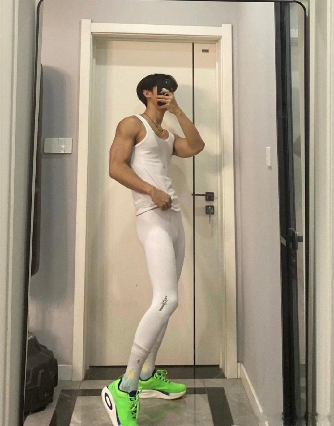 健身肌肉线条肌肉帅哥营男模健身 “全白紧身衣直接把肌肉线条焊在身上!荧光绿鞋子是今日穿搭的点睛之笔~你们健身时敢这么穿出门吗?