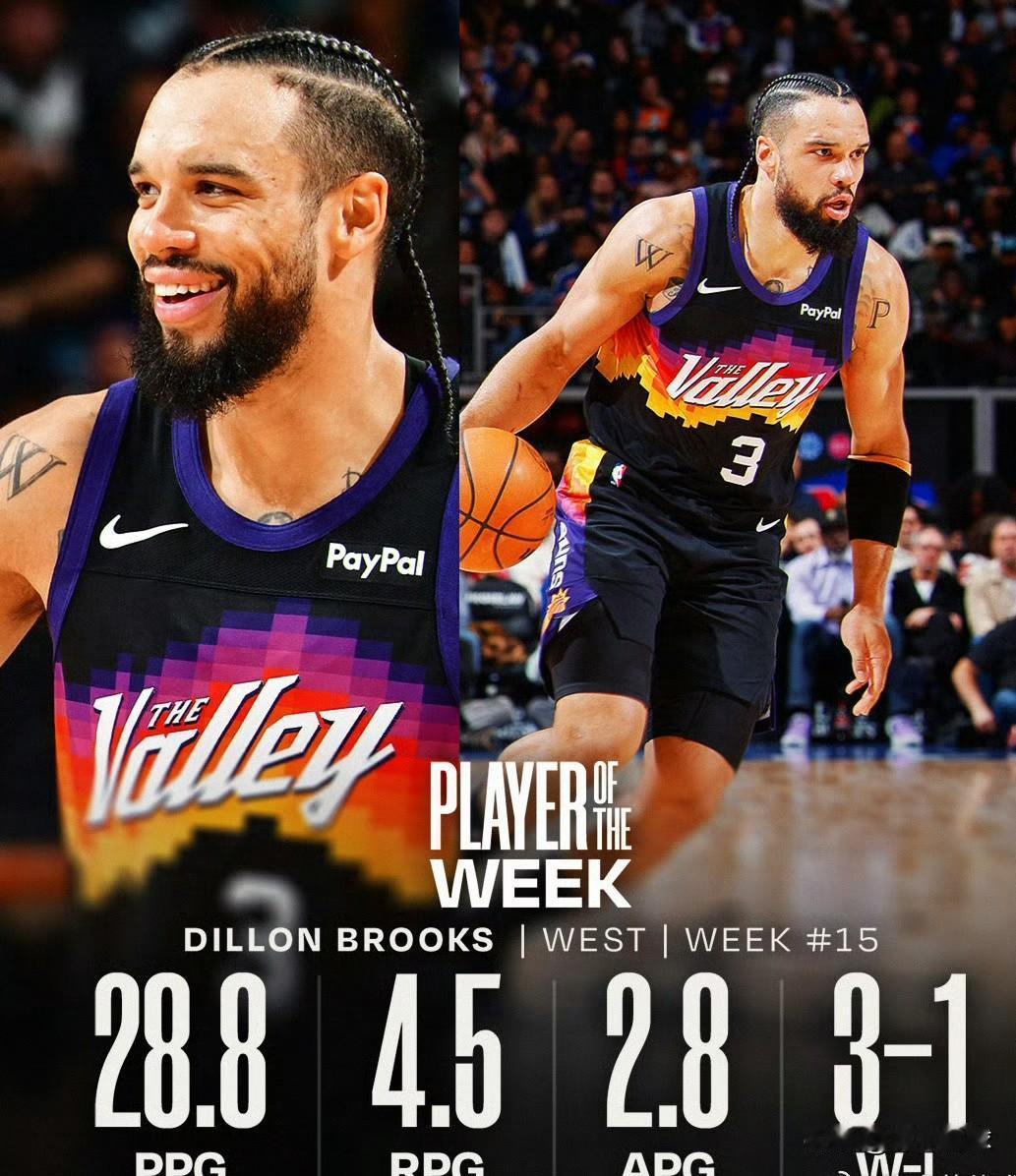 狄龙本赛季算彻底熬出头了! 今天,NBA官方公布了上周东西部周最佳球员,太阳队球员狄龙-布鲁克斯成功当选西部周最佳球员,他场均可以得到28.8分4.5篮板2.8助攻,带领太阳队在布克、格林受伤缺阵的情况下取得了3胜1负的战绩,稳固了球队的排名。 本赛季的狄龙算是熬出头了,在被交易至太阳队后,主教练奥特给予了他充足的上场时间和战术地位,他已经成为球队无可争议的二当家,赛季至今场均可以得到21.1分3.6篮板1.8助攻1.1抢断,攻防表现都有出色的表现,场均17.2次的出手次数证明了他在太阳队的战术地位。 更重要的是,狄龙如今深受太阳队老板、管理层、教练组、球员的喜爱,球队老板马特-伊什比亚曾在社交媒体上公开力挺自己的爱将,声称绝对不会交易狄龙,其他球队不要再打电话了,仅用了不到一个赛季,狄龙就已经征服了太阳队几乎所有的人,成为了球队的非卖品。 生涯至今,狄龙共效力了三支球队,分别是灰熊队、火箭队和如今的太阳队,灰熊队期间,狄龙曾被要求不能过多的投篮出手;火箭队期间,狄龙帮助球队建立了强硬的球队文化,却也被无情交易;如今在太阳队,狄龙终于找到了理解、适合自己的归宿!