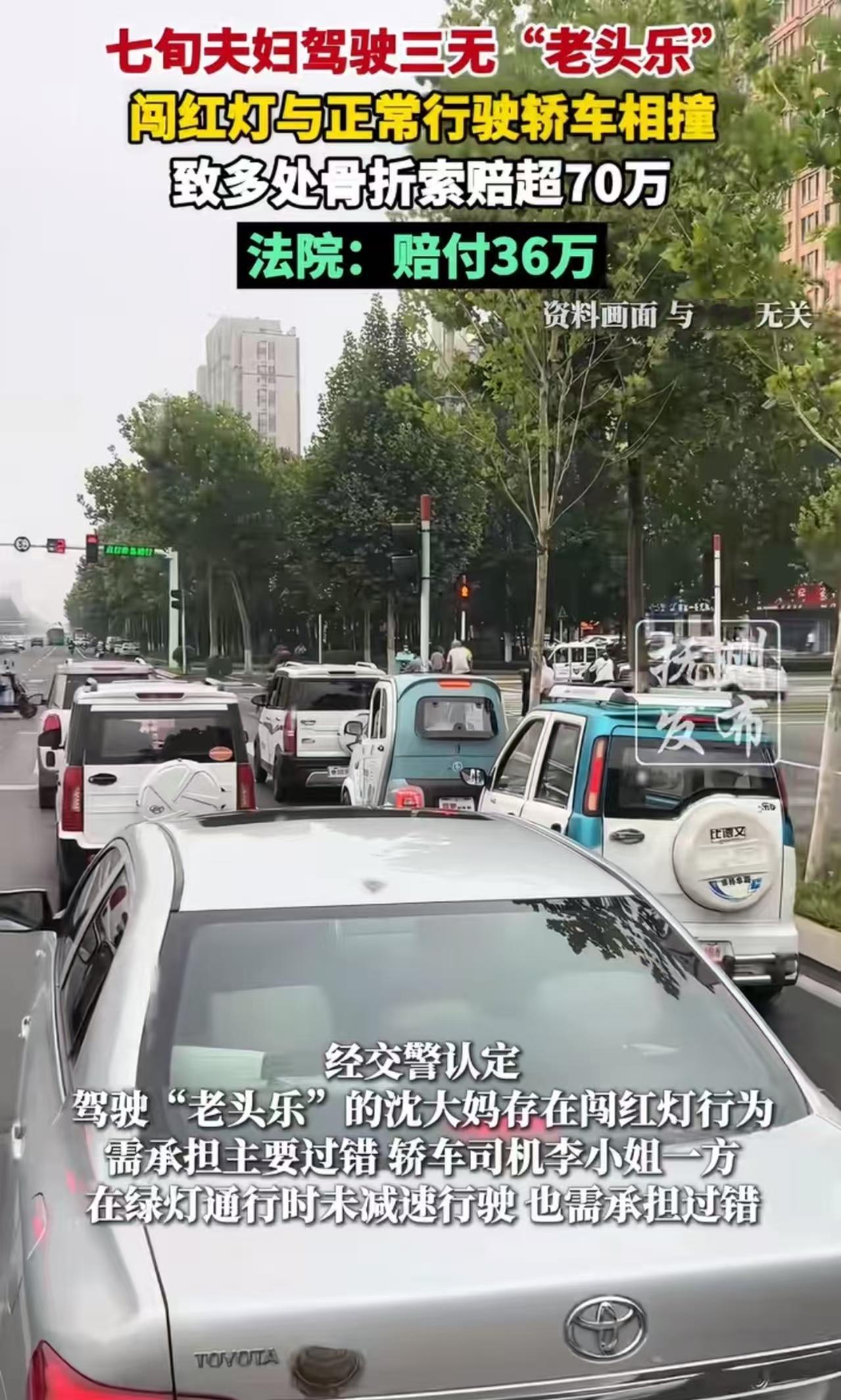 七旬夫妇驾驶三无"老头乐"闯红灯与正常行驶轿车相撞致多处骨折,起诉轿车女司机索赔超70万!法院:赔付36万!女司机:闯红灯的是我他们,我也受伤了,赔钱的怎么还是我?难道谁弱谁有理? 这天,沈大妈(化名)驾驶一辆红色“老头乐”,载着老伴黄大爷(化名),在一主干道交叉口径直闯过红灯。 此时,李小姐(化名)正驾驶车辆直行,她没想到有人会闯红灯,来不及刹车,“砰”一声巨响,“老头乐”被撞翻在地,车身严重变形。 两位老人当场倒地不起,送医后诊断为:沈大妈和黄大爷双双骨折,需长期卧床。 因为医疗费、护理费、后续康复费用迅速累积,老两口一纸诉状,将李小姐、其所在保险公司告上法庭,索赔总额高达72.8万元。 交警调查后出具事故认定书: 沈大妈驾驶“三无”车辆闯红灯,负主要责任; 李小姐在通过路口时未充分观察、未采取必要减速措施,负次要责任。 法院据此判决: 保险公司在交强险和商业三者险范围内赔付35万元; 李小姐所属公司承担律师费6000元;合计36万元由“正常行驶方”承担。 李小姐彻底懵了:“我绿灯正常走,她闯红灯撞我,结果我还得赔36万?那‘主责’到底意味着什么?难道法律是按谁伤得重来判的?” 此事迅速引爆网络,观点两极分化: 有网友说,如果你学过科目一,你就知道过红绿灯车辆要减速,这就是李小姐次责的原因。 也有网友说,按交通法论事,无牌无路权、闯红灯出事故的车及其车主,就该是全责,正常行驶的车及车主就不应该赔偿。此事的判决与交通法不符。 还有网友说,谁闯红灯谁全责,而且是三无的老头乐,必须由老头乐全责并赔付轿车损失! 三无老头乐本就不该上路!无牌无照无保险,还闯红灯,等于开着‘马路炸弹’。这种情况下,守法司机凭什么赔钱?” 这起案件撕开了中国交通法治最尴尬的裂口——当“弱势违法者”遇上“守法驾驶人”,法律究竟该保护秩序,还是同情弱者? 法院依据现行法条判李小姐承担次责,技术上或许无错。但公众的愤怒,源于一种更深层的不安:如果遵守规则的人反而要为破坏规则者买单,那规则的意义何在? 更值得警惕的是,“老头乐”乱象已成公共安全定时炸弹。它们无牌照、无保险、无安全标准,却常年混迹机动车道,闯红灯、逆行、随意变道如家常便饭。 而一旦出事,受害者反成“加害方”,守法司机反成“赔偿人”——这不仅是法律的悖论,更是治理的失职。 真正的司法公正,不应止于“按比例分摊损失”,而应推动“谁违法谁担全责”的底线回归。 否则,今天的36万,明天可能变成360万—— 当违法成本低于守法代价,文明交通将永远是一句空话。 法律可以体恤老人,但不能纵容危险;同情可以温暖人心,但不能扭曲是非。 否则,下一个被撞的,可能是你我; 而下一个被迫赔钱的,也可能就是你自己。