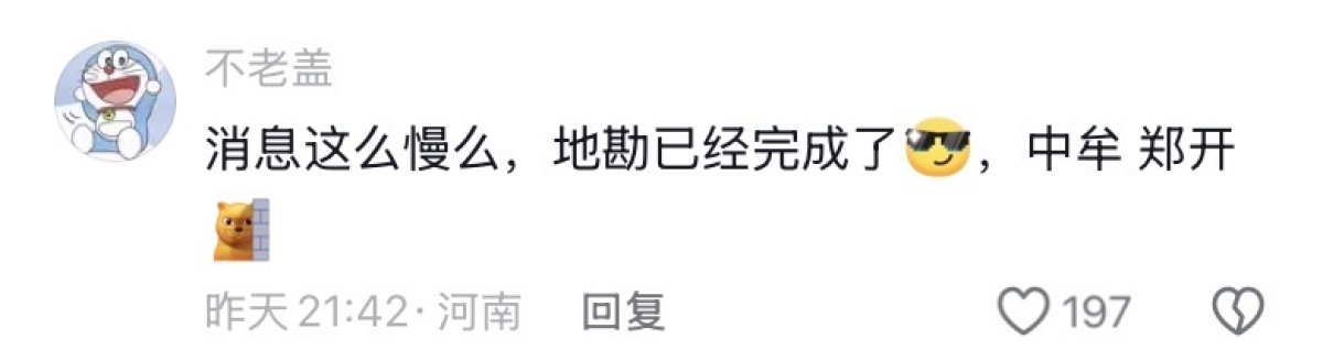 网友@不老盖表示:“消息这么慢么,地勘已经完成了,位置在中牟。”