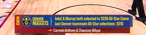 约基奇在早前被选进全明星首发,他们成为自2010年以来首对同时入选全明星的掘金队友。