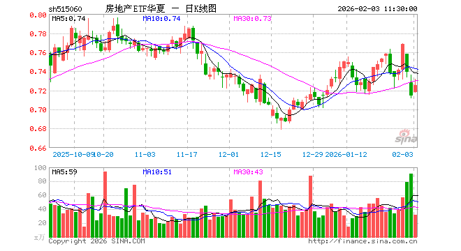 2月3日,截止午间收盘,房地产ETF华夏(515060)涨1.54%,报0.725元,成交额2344.77万元。房地产ETF华夏(515060)重仓股方面,保利发展截止午盘涨1.36%,张江高科涨1.45%,万科A涨0.21%,招商蛇口涨0.50%,海南机场涨0.90%,衢州发展涨0.28%,万通发展涨2.68%,新城控股涨2.07%,滨江集团涨4.76%,先导基电涨2.43%。