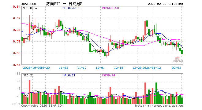 2月3日,截止午间收盘,券商ETF(512000)跌0.89%,报0.558元,成交额9.11亿元。券商ETF(512000)重仓股方面,东方财富截止午盘涨0.27%,中信证券跌0.18%,国泰海通跌1.68%,华泰证券跌6.08%,广发证券跌2.35%,招商证券跌1.01%,东方证券涨0.00%,兴业证券跌0.74%,申万宏源跌0.40%,中金公司涨1.23%。