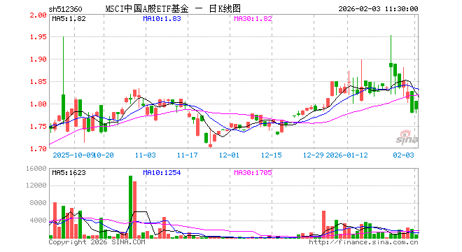 2月3日,截止午间收盘,MSCI中国A股ETF基金(512360)涨0.45%,报1.787元,成交额11.76万元。MSCI中国A股ETF基金(512360)重仓股方面,贵州茅台截止午盘涨2.10%,宁德时代跌1.04%,招商银行跌0.36%,工业富联跌1.44%,中国平安涨0.42%,紫金矿业涨2.76%,长江电力跌0.61%,中际旭创跌1.06%,农业银行跌1.47%,寒武纪跌12.88%。