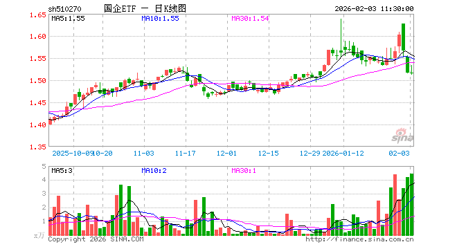 2月3日,截止午间收盘,国企ETF(510270)跌0.07%,报1.516元,成交额681.92万元。国企ETF(510270)重仓股方面,贵州茅台截止午盘涨2.10%,紫金矿业涨2.76%,长江电力跌0.61%,招商银行跌0.36%,中信证券跌0.18%,国泰海通跌1.68%,兴业银行跌0.11%,工商银行跌1.50%,中国船舶涨2.96%,万华化学涨2.33%。