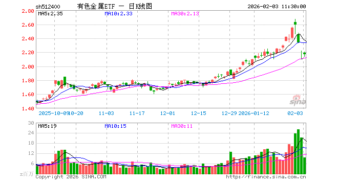 2月3日,截止午间收盘,有色金属ETF(512400)涨2.95%,报2.167元,成交额20.60亿元。有色金属ETF(512400)重仓股方面,紫金矿业截止午盘涨2.76%,洛阳钼业涨1.77%,北方稀土涨3.32%,华友钴业涨0.12%,中国铝业涨1.10%,赣锋锂业涨1.56%,山东黄金跌6.72%,云铝股份跌1.46%,中金黄金跌8.49%,藏格矿业涨2.57%。