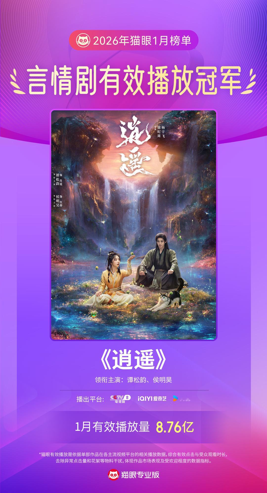 逍遥1月言情剧有效播放双榜冠军 据猫眼专业版数据,领衔主演电视剧《逍遥》1月有效播放量8.76亿、集均有效播放量2191.0万,成为2026年1月言情剧有效播放双榜冠军!猫眼1月剧集有效播放榜