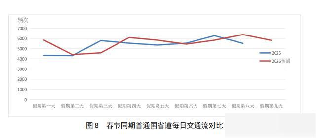 普通国省道方面,预计交通流量从除夕开始呈现波动上升趋势,在2月22日(初六)达到峰值。