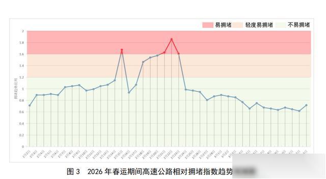 预计今年春运期间在春节后半段高速路网较为拥堵,2月22日(初六)出现春运期间路网拥堵峰值。春运前期、后期出行较分散,不会出现明显拥堵。