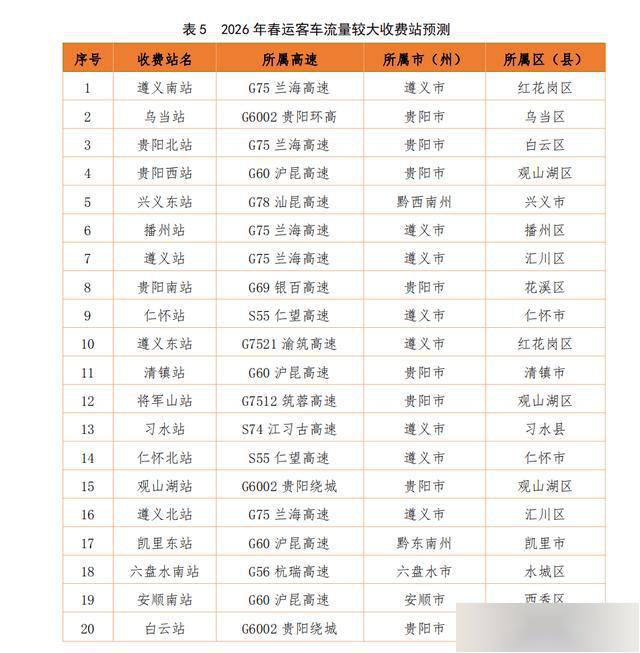客车方面,预计遵义南、乌当、贵阳北等20个主要枢纽收费站客车通行压力较大,主要集中在贵阳、遵义等市州。