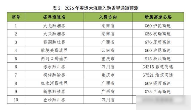 预计湖南、重庆方向出黔、入黔省界通道流量较大,10个出黔、入黔大流量省界通道。