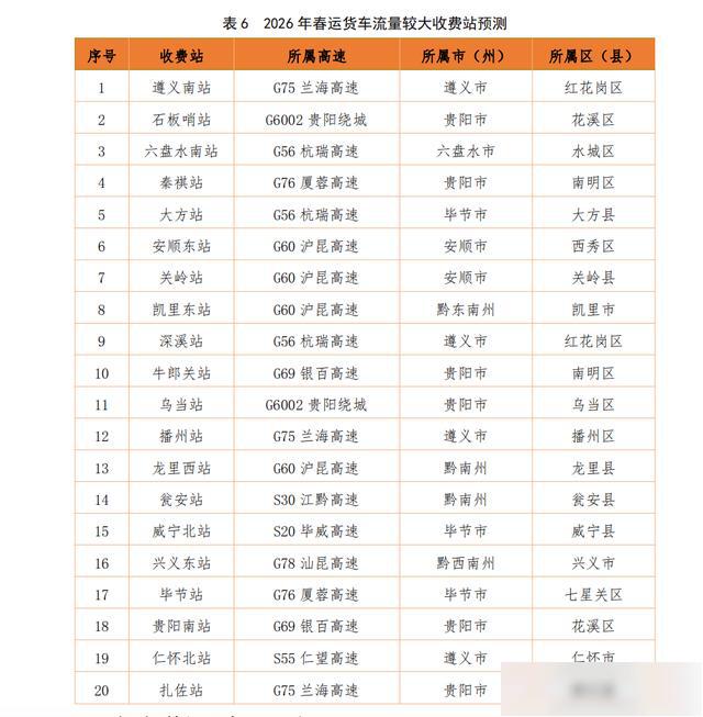 货车方面,春运期间保暖保供、民生、春耕备耕等物资运输需求旺盛,预计遵义南、石板哨、六盘水南等20个收费站货车流量较大,需要关注收费站广场、货车通道等的管控疏导。