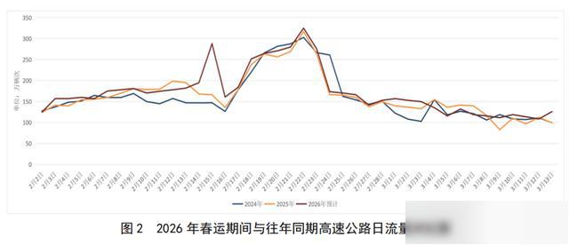 春运后期(2月24日至3月13日),预计高速公路日均流量为136.6万辆次,同比上升3.4%。