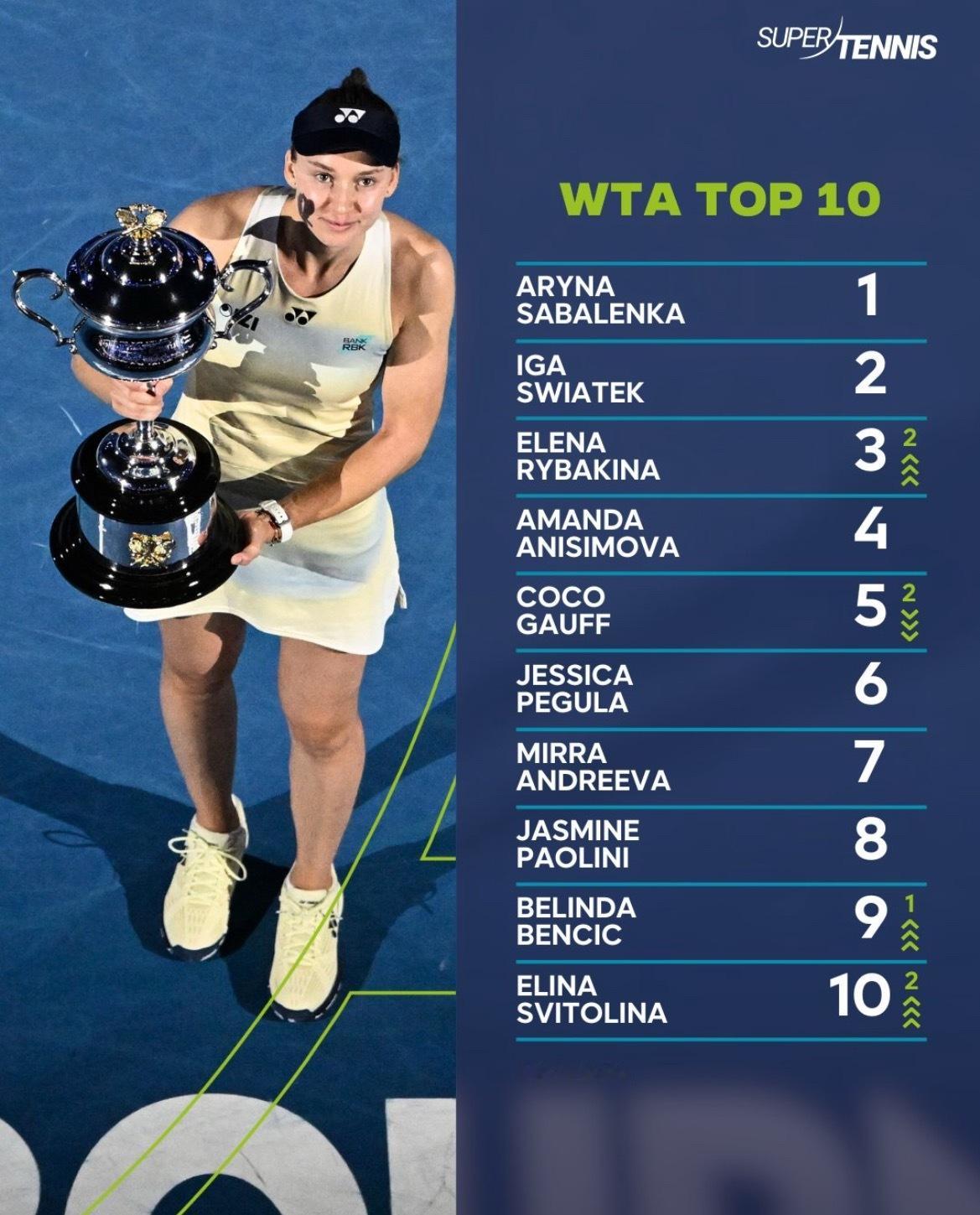 网球talking大会澳网2026 过后,最新世界排名前十如下:莱巴金娜重回第三