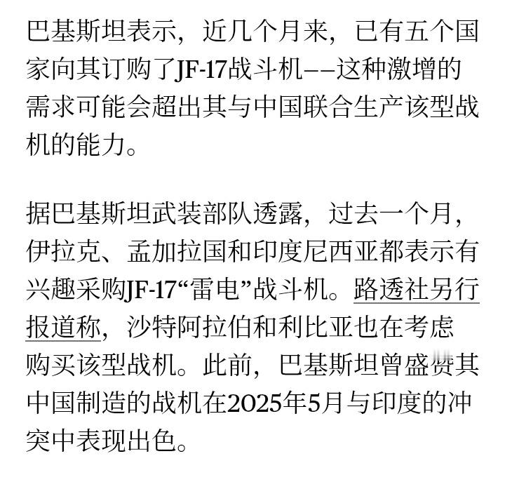 彭博社:巴基斯坦表示,近几个月来,已有五个国家向其提出购买JF -17战斗机的请求,这种需求的激增可能会超出巴基斯坦与中国联合生产该型战机的能力。