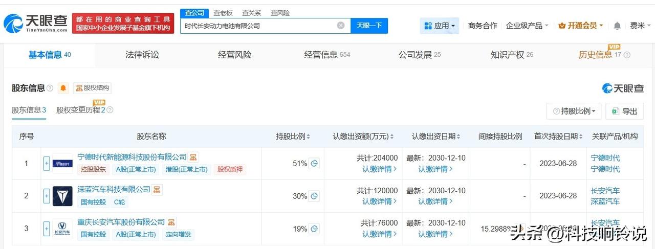 【宁德时代、深蓝汽车、长安汽车合资公司增资至40亿 增幅约167%】 天眼查App显示,近日,时代长安动力电池有限公司发生工商变更,注册资本由15亿人民币增至40亿人民币,增幅约167%。 时代长安动力电池有限公司成立于2023年6月,法定代表人为朱云峰,经营范围包括电池制造、电池销售、新兴能源技术研发、新材料技术研发等。股东信息显示,该公司由宁德时代(300750)、深蓝汽车科技有限公司、长安汽车(000625)共同持股。 天眼查信息: