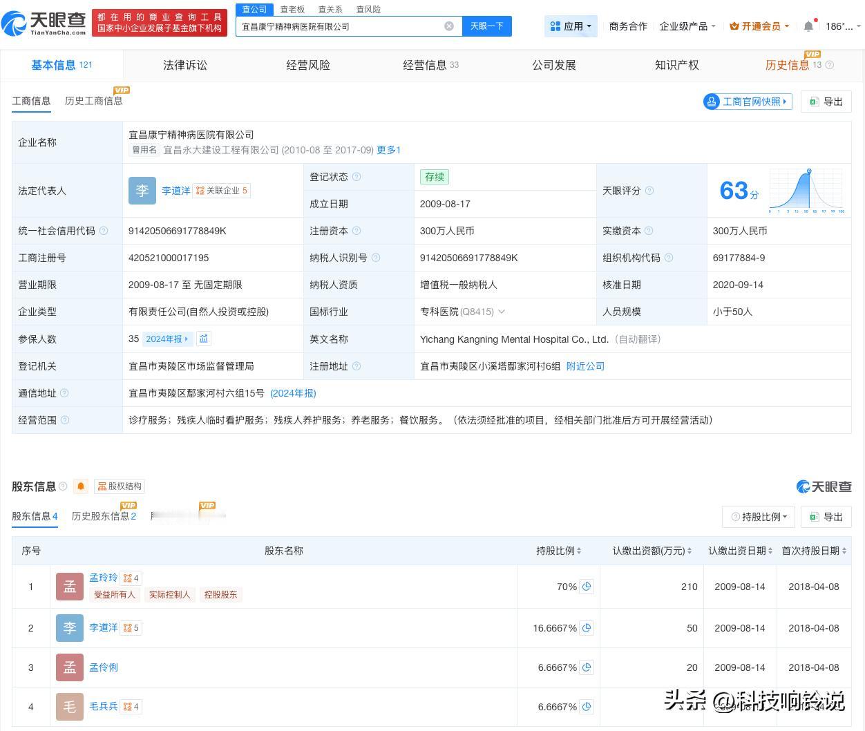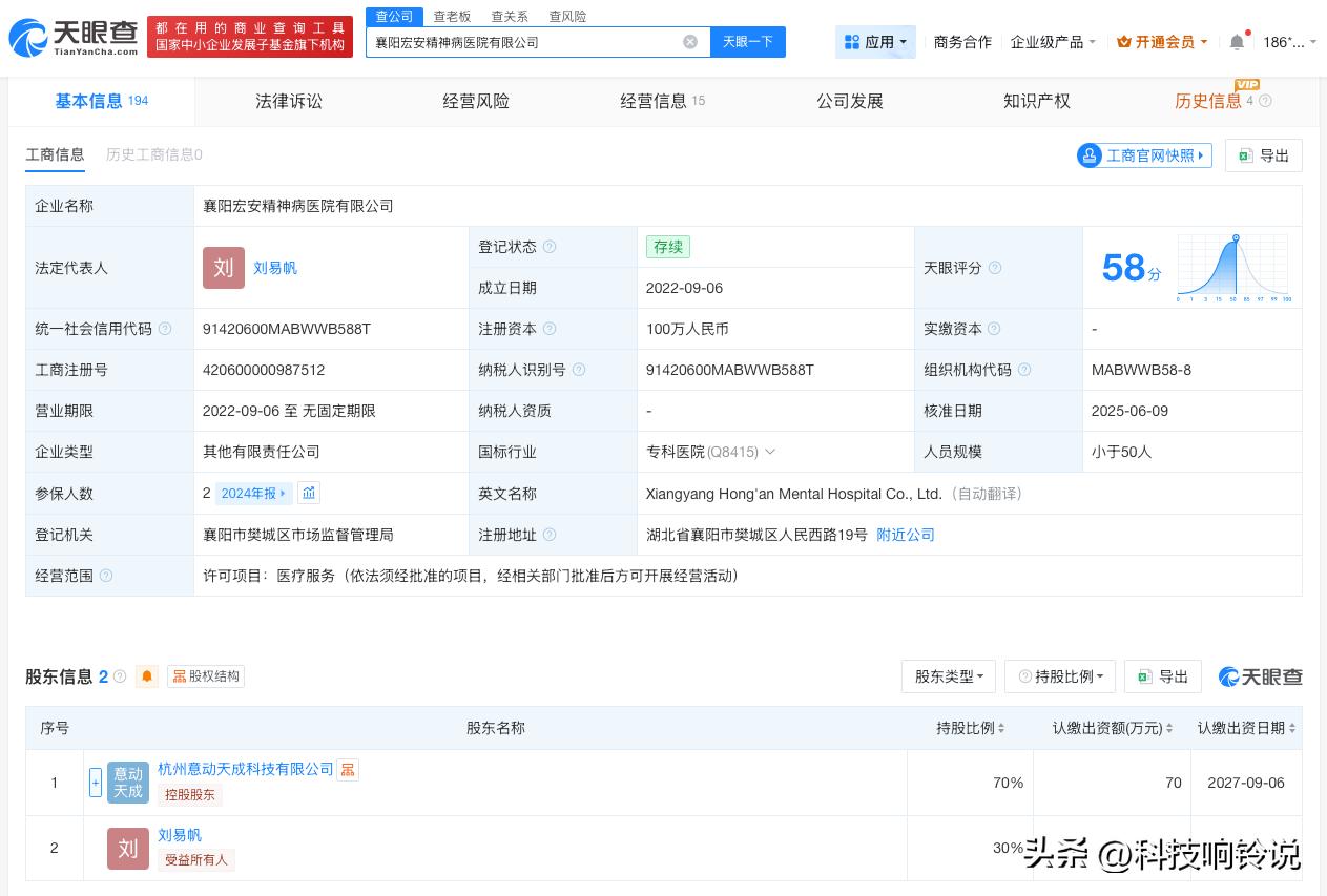 【揭秘骗保精神病医院关联公司 骗保精神病医院此前曾为建设工程公司】精神病医院骗保调查 据报道,襄阳一家精神病医院的医生对病人家属承诺“医药费和生活费全免,可以常年住”,这背后隐藏着一条以医保基金为目标的产业链。记者调查发现,包括湖北襄阳宏安精神病医院、湖北宜昌夷陵康宁精神病医院在内的多家精神病医院存在相关问题。 天眼查工商信息显示,襄阳宏安精神病医院有限公司成立于2022年9月,法定代表人为刘易帆,注册资本100万人民币,经营范围为医疗服务。股东信息显示,该公司由杭州意动天成科技有限公司、刘易帆共同持股。 宜昌康宁精神病医院有限公司成立于2009年8月,法定代表人为李道洋,注册资本300万人民币,经营范围为诊疗服务、残疾人临时看护服务、残疾人养护服务、养老服务、餐饮服务。股东信息显示,该公司由孟玲玲、李道洋等共同持股。值得注意的是,此前该公司企业名称为宜昌永大建设工程有限公司。 天眼查信息: