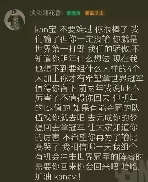 粉丝回顾蓝莲花给Kanavi的留言:我们输了,但你没输,你就是世界第一打野