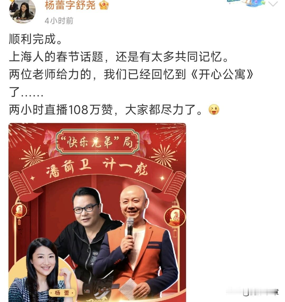 都在说现在电视节目收视下降,观众变身网友冲进直播间看节目已是大势所趋。昨天,由杨蕾主持的《嘎讪胡》两小时直播获得108万点赞,主持人本人发微博祝贺直播战绩。 这档讲述上海人过春节的特辑,邀请了计一彪、潘前卫助阵,两位滑稽圈的大咖也不负众望,从多个纬度唤醒上海人过春节的记忆。两位主角在上海荧屏一直拥有号召力,得益于20年前的《开心公寓》。都说一部剧一个角色可以吃一辈子红利,这话还是有道理的。 杨蕾,一直是很棒的主持人。驾驭访谈节目毫无压力,无论是入行时的新闻主播身份,中期变身《娱乐在线》主播,到如今的“沪上调解一姐”,都展现其扎实的知识储备和主持业务。