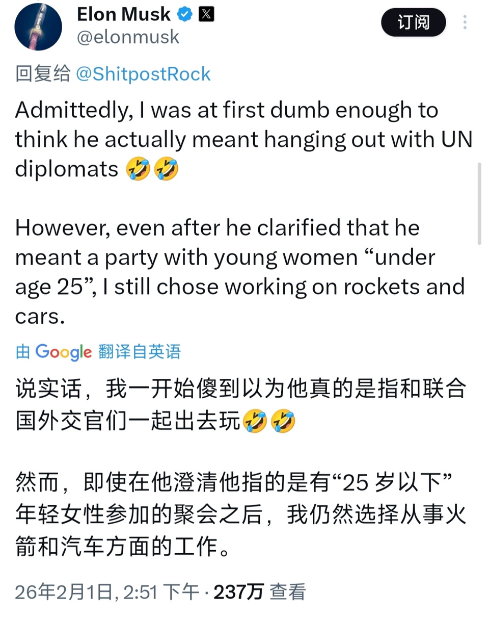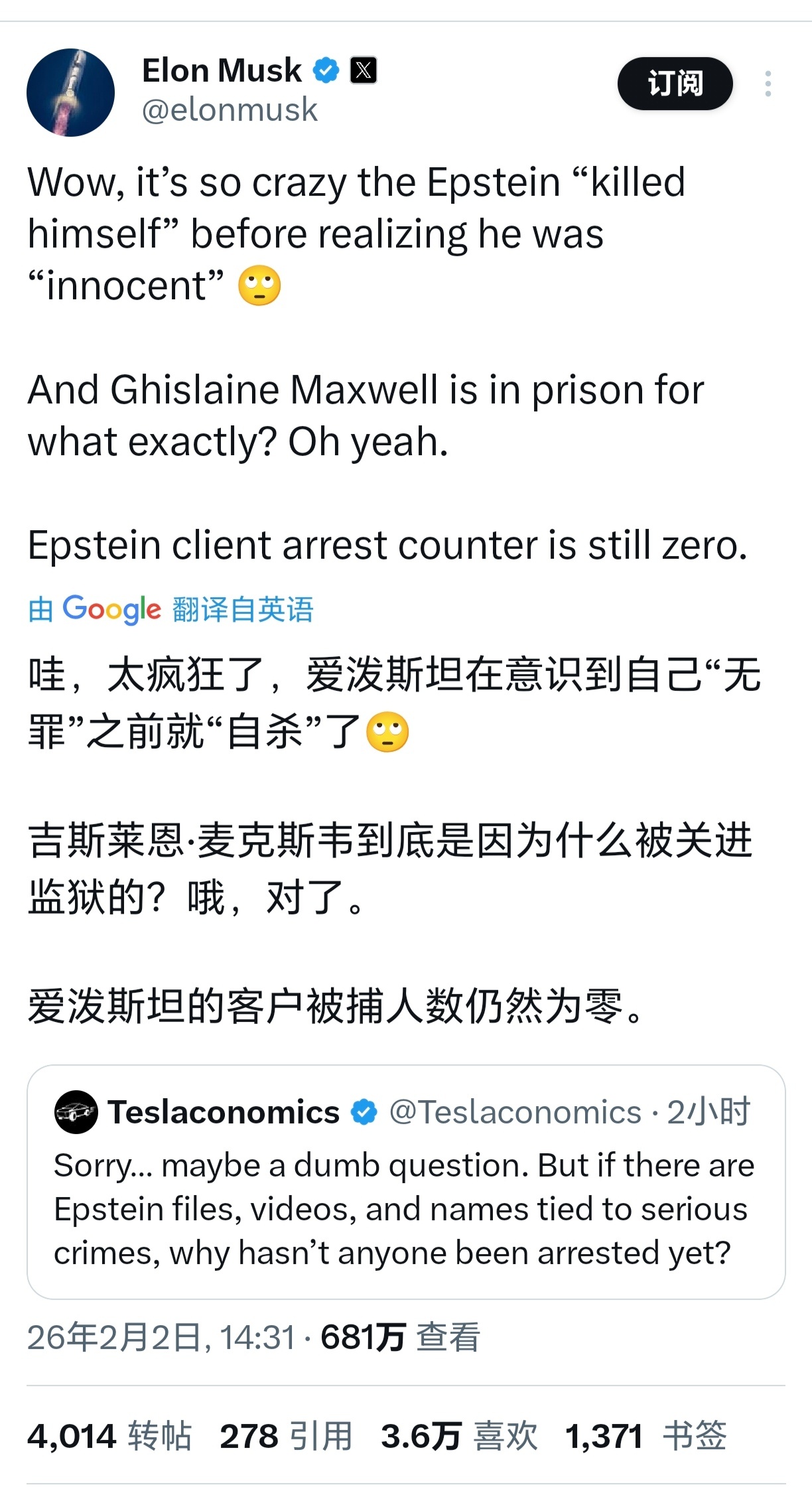 马斯克在想,爱泼斯坦死早了,想拉出来揍一顿都找不到人,想撒个灰啥的也没戏。爱泼斯