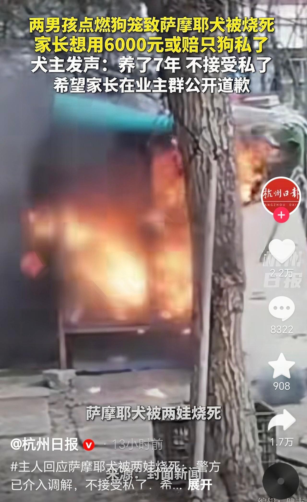 男童点火烧死萨摩耶家属发声自家小孩养了七年被熊孩子烧死,就赔6000,一年狗粮洗护钱都不止。轻飘飘的道歉,和几千块,养了七年活生生被烧死,这么痛苦的死,人家主人怎么受得了。 看一个原声视频,那只狗,凄惨的叫声真的很揪心[流泪]。