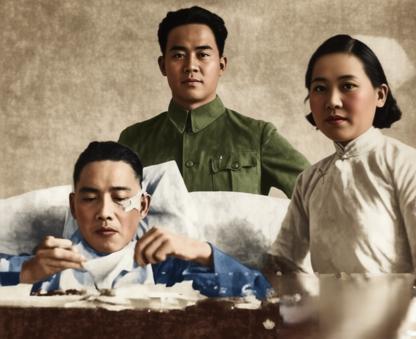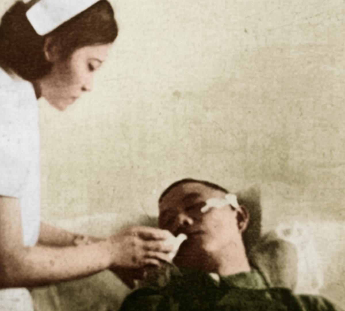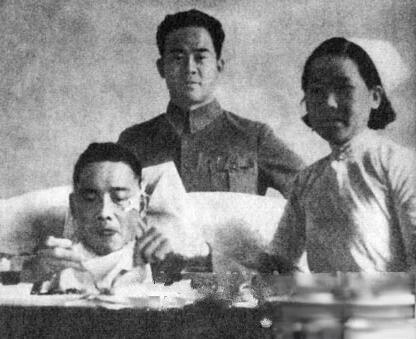 这组照片是汪精卫在1935年11月1日遇刺后,于南京中央医院接受治疗时的真实影像。汪精卫躺在病床上,蒙着厚厚的纱布,后面立者乃其秘书曾仲鸣,女子是护士,当时国民党军队和医院有不少女护士,她们负责换药、喂食、护理。 1935年11月1日,国民党四届六中全会在南京中央党部开幕。全体中央委员在党部大院集体合影。蒋介石临时未参加合影(据说是因为对服装不整齐不满,或有其他原因),汪精卫作为副主席站在中央位置。化装成“晨光通讯社记者”的刺客孙凤鸣(实际受王亚樵、华克之指使,原十九路军军官,对“不抵抗政策”不满),用藏在照相机里的白朗宁手枪连开三枪,第一枪击中汪精卫左脸颊,第二枪击中左臂,第三枪击中后背/脊椎附近(子弹嵌入第六、七胸椎附近,未能取出)。 张继抱住刺客,张学良一脚踢飞手枪,卫士开枪击伤孙凤鸣(次日死亡)。汪精卫中三枪倒地,蒋介石闻讯赶到现场。立即送往中央医院。德国医生诺尔(汪的御用医生)从西安赶回,取出脸部和臂部子弹,但脊椎子弹因位置危险、医疗条件有限,留在体内。