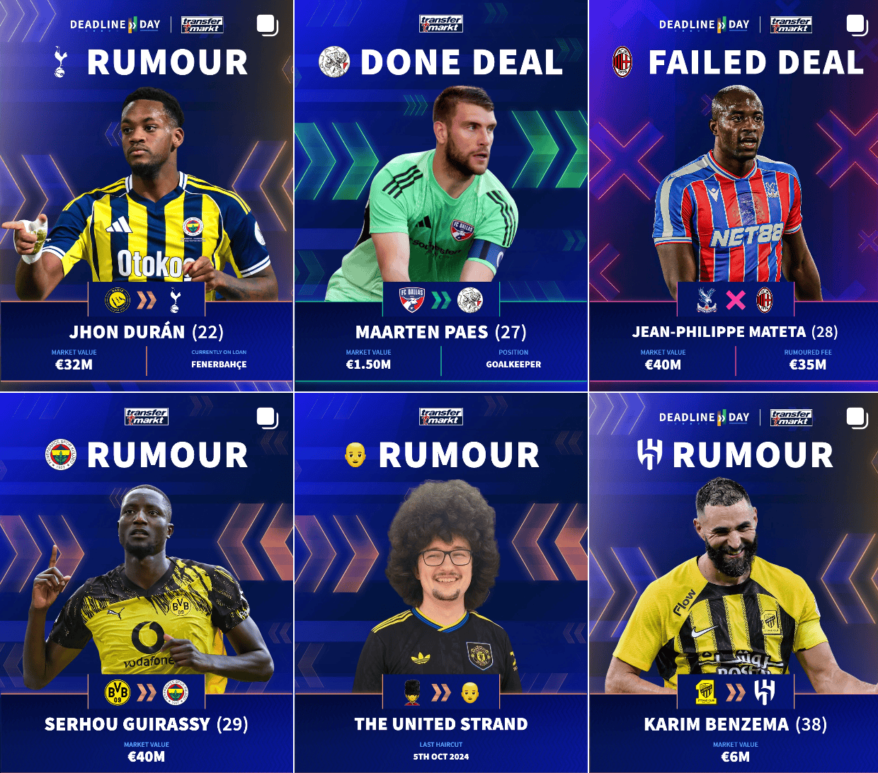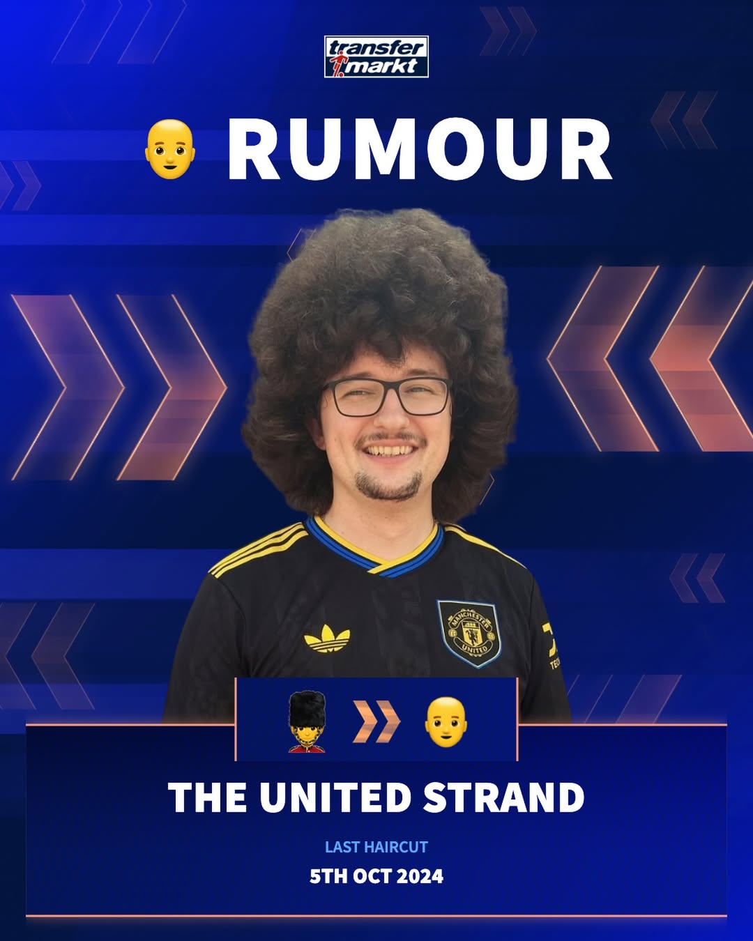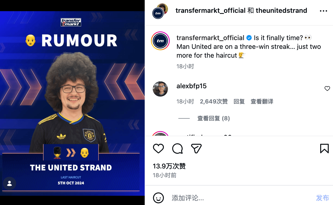 虎扑02月03日讯在冬季转会窗的一组转会传闻图片中,德转(Transfermarkt)官方社媒幽默地夹杂了一张调侃图,画面中展示了“蓄发哥”的形象,并配文:“曼联已经迎来了三连胜,再赢两场,‘蓄发哥’就该剪发了!”