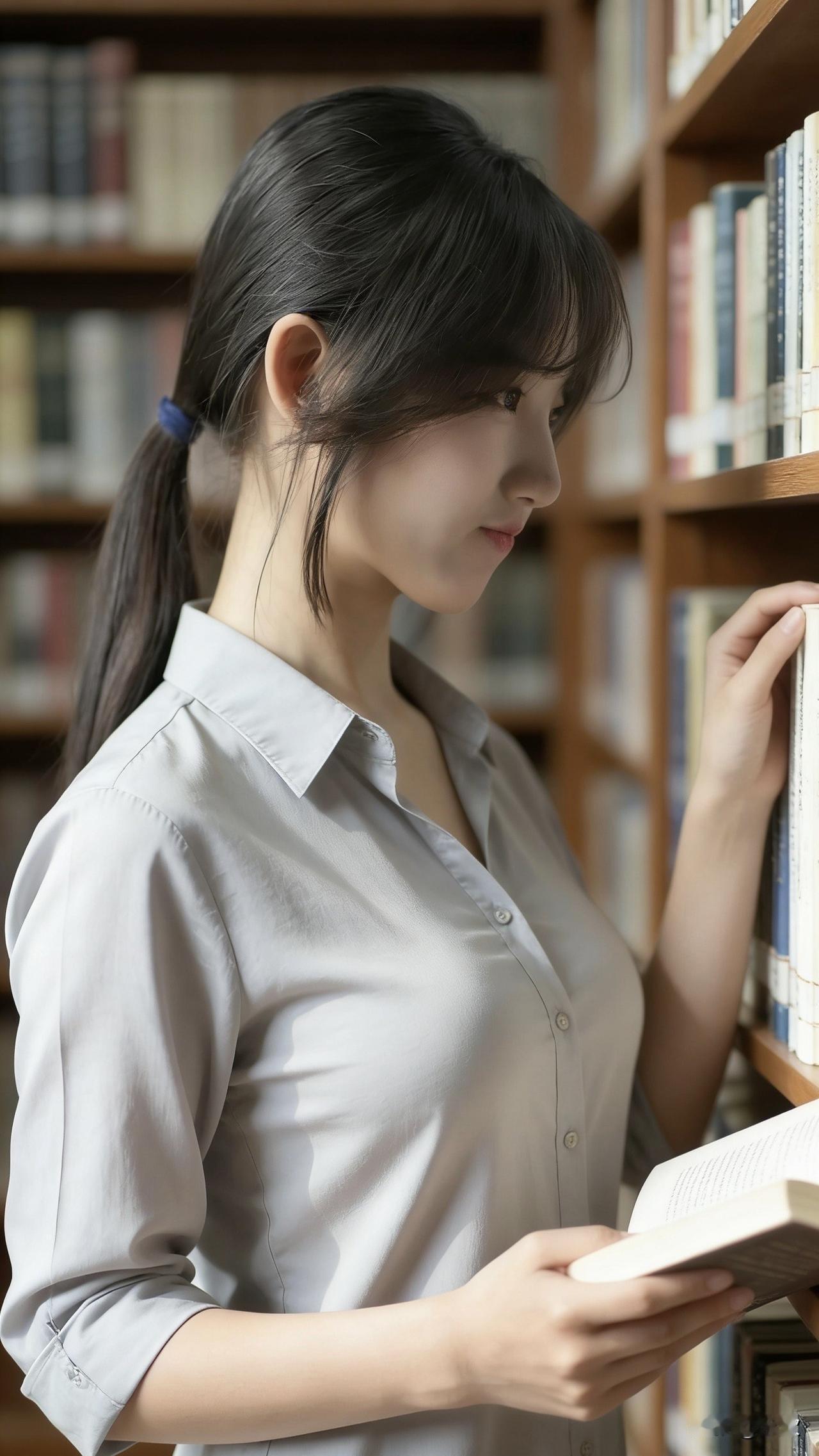 浅灰衬衫的衣角蹭过木质书架的纹理,她指尖轻捻书页,目光随着铅字缓缓游走。阳光穿过