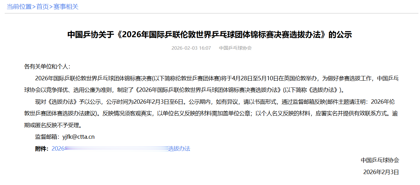 虎扑02月03日讯中国乒协在官网公示了《2026年国际乒联伦敦世界乒乓球团体锦标赛决赛选拔办法》