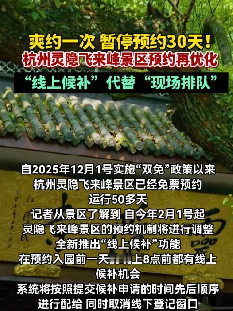 灵隐寺急了!38万“赛博鸽王”逼出最严新规,爽约一次禁约30天 谁能想到,杭州灵隐寺免票预约,竟被“鸽”到升级惩戒! 自2025年12月实行免票预约制以来,仅仅56天,就有38万人次爽约,占总预约量近20%,单日最高爽约2.2万人! 大量预约名额被浪费,真正想去的人抢不到,网友戏称这些爽约者为“赛博鸽王”,直言“占着名额不烧香”。 被逼无奈之下,灵隐寺从2026年2月1日起,正式执行“最严惩戒新规”:爽约1次,禁约30天;爽约2次,禁约60天;爽约3次,直接禁约90天! 同步升级的还有预约服务——新增线上候补功能,方便未抢到名额的游客捡漏,同时彻底取消线下登记窗口,倒逼大家珍惜预约名额。 新规一出,网友两极分化:有人支持“就该这样,杜绝浪费”,也有人吐槽“偶尔有事没法去,惩罚太严”。 其实免票是福利,预约是责任,愿每一份善意,都不被“爽约”辜负,也愿真正心怀敬畏的人,都能顺利赴一场灵隐之约~