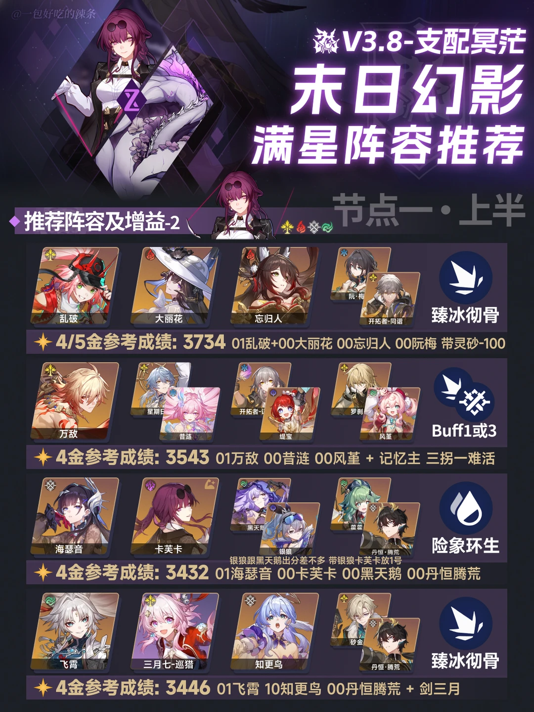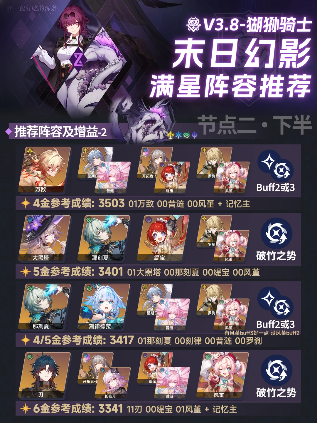 滴滴!这里是辣条 这期是3.8版本第二期末日的阵容推荐 - 本期血量对比上期有所降低,体感难度差不多 上半相对简单 有1鸟的话 飞霄带剑三月也能及格线以上,剑三月应该是最近几期推荐里面唯一的四星了 下半死龙3.6打过 这玩意有800韧性 要慢慢磨或者走机制,除了遐蝶和击破 其他队伍出分都不高 -