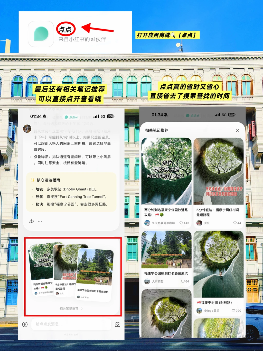 每次出门犯愁的时候,直接问点点,能汇总上海量优质笔记的亲身经验和评价,讲解都是图文并茂的!还能直接跳转优质的攻略笔记,不用再自己翻几十篇笔记啦~