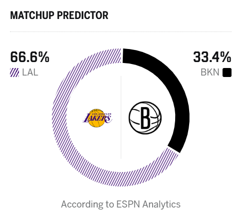 ESPN预测明日比赛:湖人胜率66.6%,篮网胜率33.4%