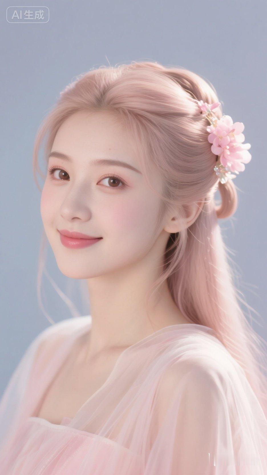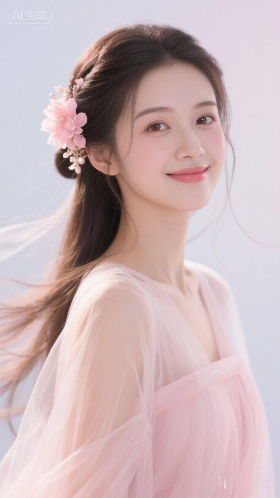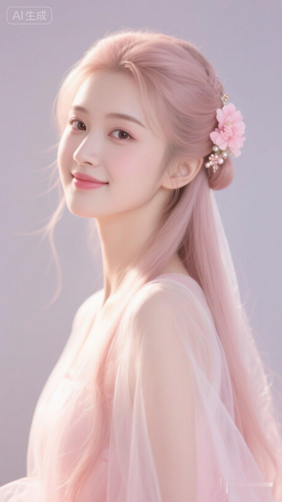 温柔粉嫩少女,甜美笑容,粉色花朵发饰,梦幻飘逸裙摆。