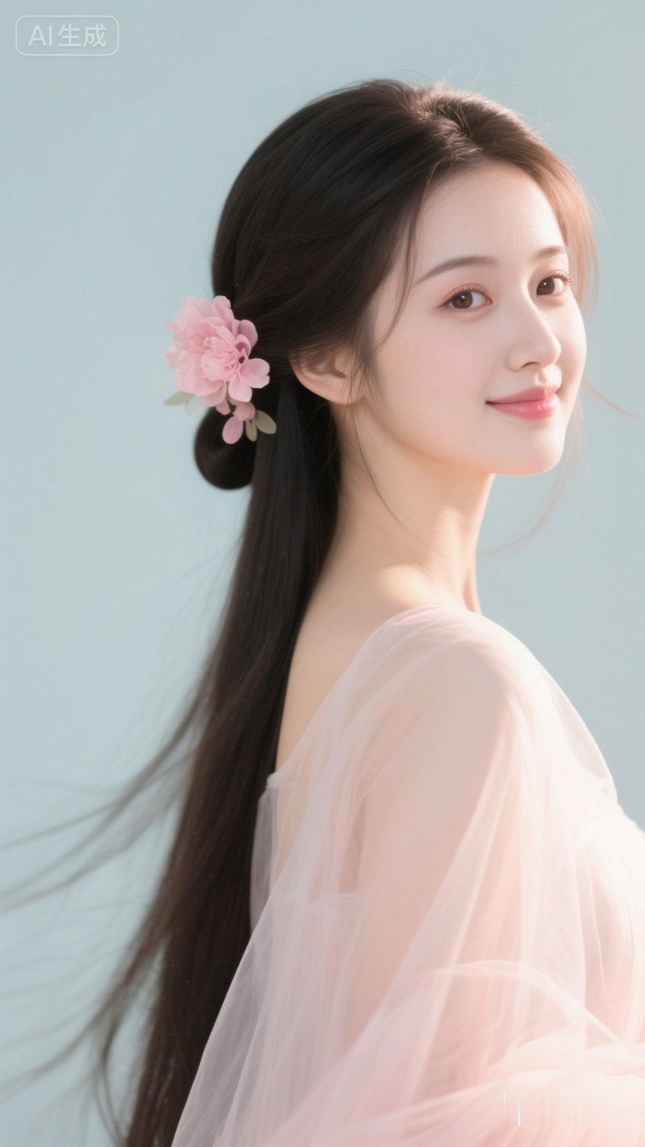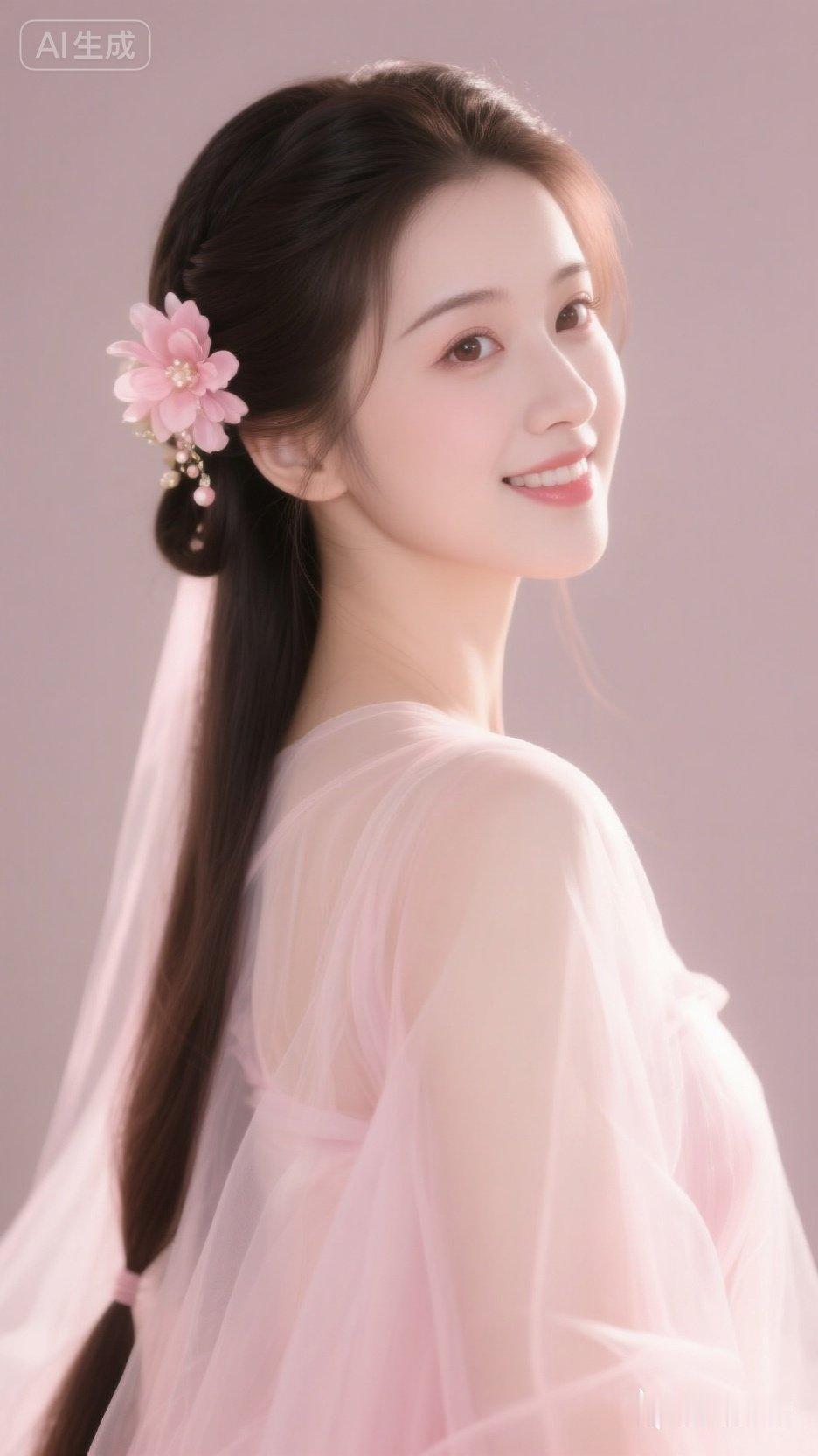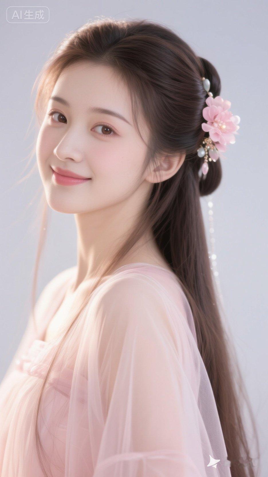 温柔粉嫩少女,甜美笑容,粉色花朵发饰,梦幻飘逸裙摆。