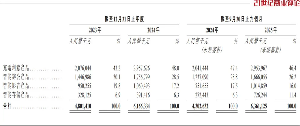 “按2025年零售额计,在全球充电产品市场,我们排第二。”招股书称,2025年1-9月,充电创意产品入账29.5亿元,贡献近五成收入。