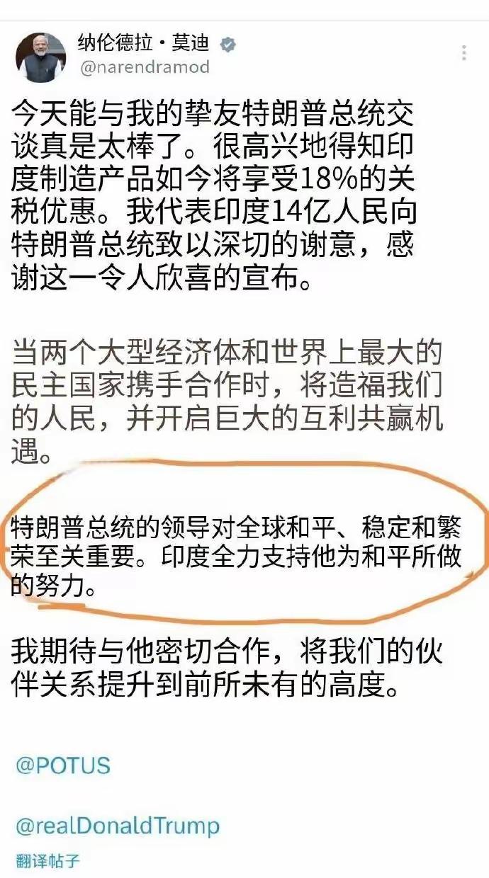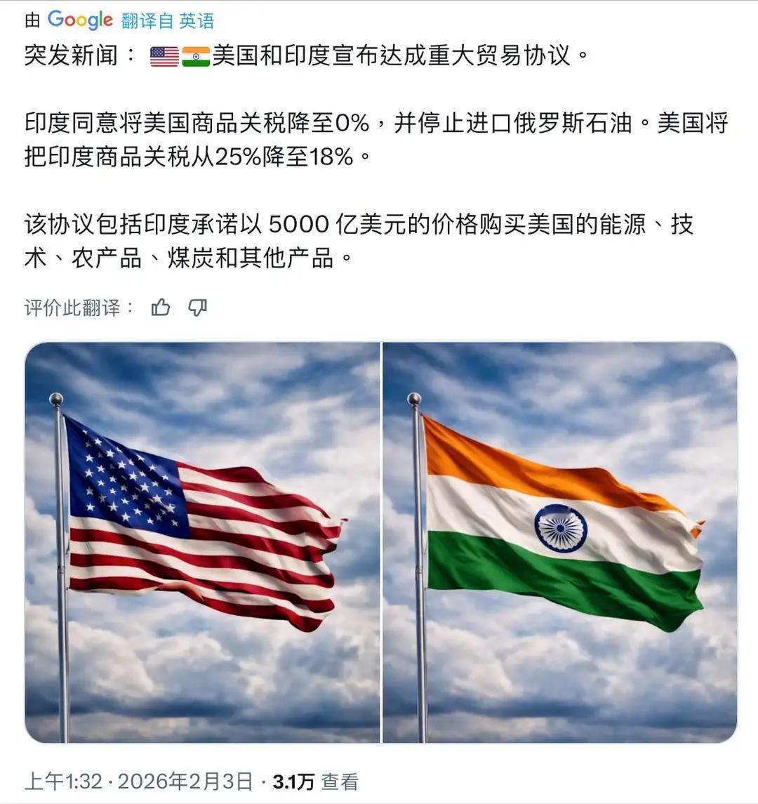 莫迪为了降点关税,和特朗普达成的这协议真是够屈辱的。美国把对印度商品关税从50%降到18%,看似降了不少,可还是远高于2024年2% - 3%的水平。但莫迪政府就跟如获大赦一样。 而美国开出的条件很苛刻,让印度停止买俄罗斯石油,去买美国及被美控制的委内瑞拉的能源。印度还得承诺未来采购超5000亿美元的美国能源、技术和农产品,取消对美关税壁垒。这哪是双赢,分明是美国占大便宜,莫迪这是把印度往二流国家的坑里带,还可能让俄印关系变得更复杂。 甚至莫迪还亲自发贴,大拍特朗普的马屁,就这么屈辱的跪了!