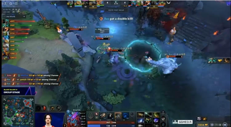 [8分钟]中路团战Fy蝙蝠被击杀,但是Xxs獣支援到位,一个举还留到了Crystallis电魂!残局NTS小小丢Ame蚂蚁追击,这波Xxs獣双杀,XG一波1换4直接反超经济!
