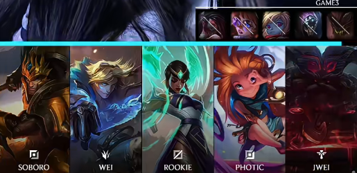 IG选用:Soboro奥恩;Wei皇子;Rookie佐伊;Photic伊泽瑞尔;Jwei卡尔玛