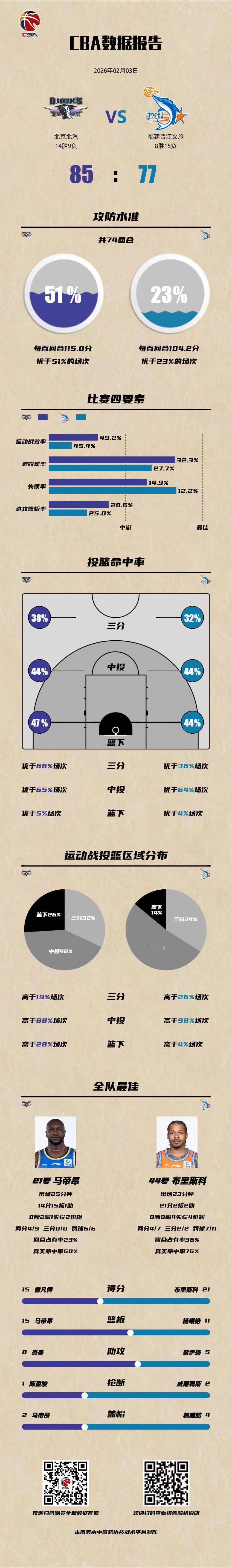 北京北汽 85-77 福建晋江文旅 北京男篮vs福建男篮 北京北汽:曾凡博15分5篮板,马帝昂14分15篮板2盖帽,杰曼14分8助攻; 福建晋江文旅:布里斯科21分,邹阳13分3篮板,特莱斯12分3篮板。以城之名
