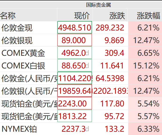 COMEX黄金涨超6%,COMEX白银涨超15%。现货铂金、钯金同步大涨,盘中涨超5%。