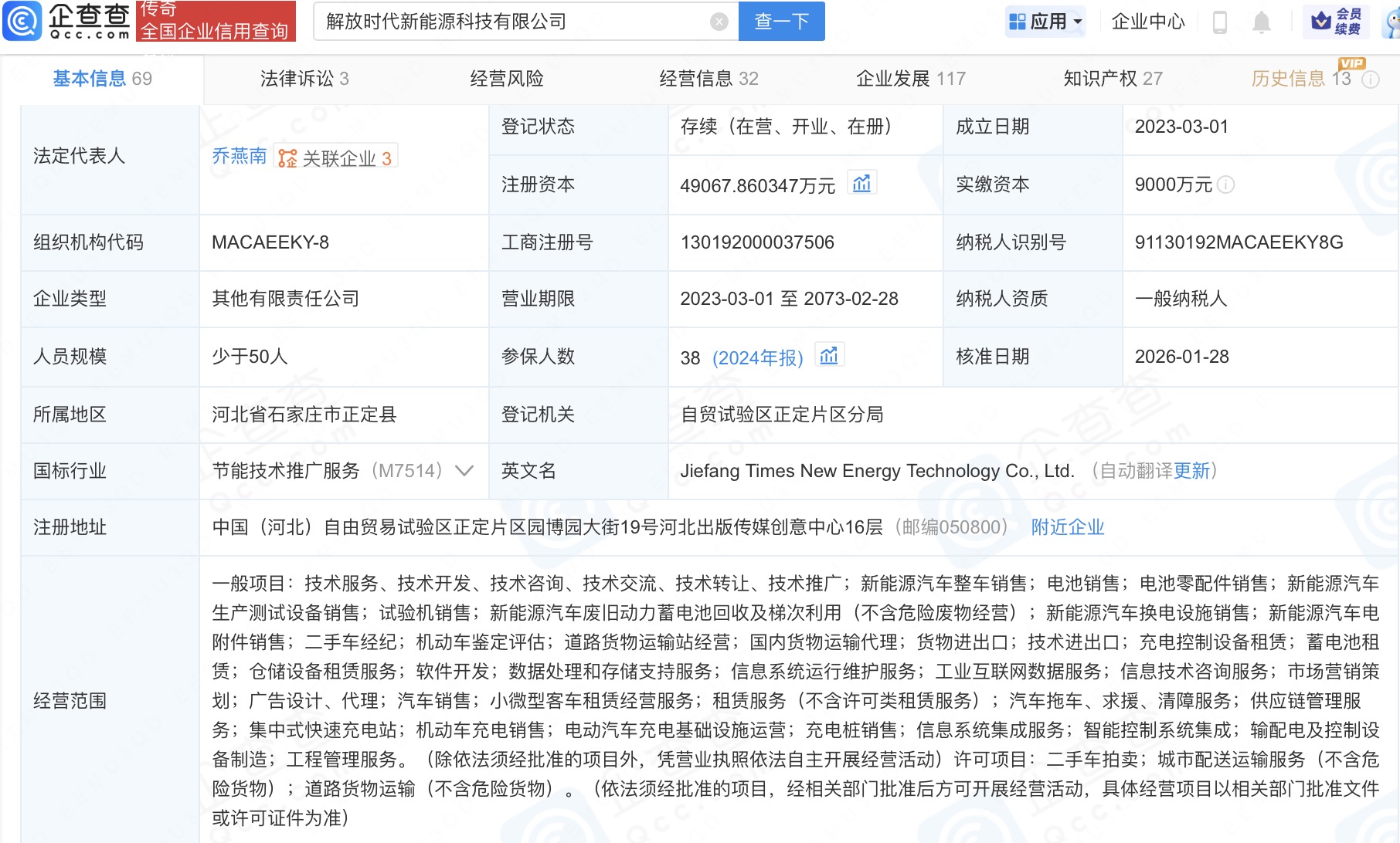 企查查APP显示,近日,解放时代新能源科技有限公司发生工商变更,新增特锐德(300001)旗下特来电新能源股份有限公司为股东,同时,注册资本由9000万元增至约4.9亿元。企查查信息显示,该公司成立于2023年,经营范围包括新能源汽车整车销售、电池销售、电池零配件销售等,现由一汽解放(000800)全资子公司一汽解放汽车有限公司、宁德时代(300750)及上述新增股东共同持股。